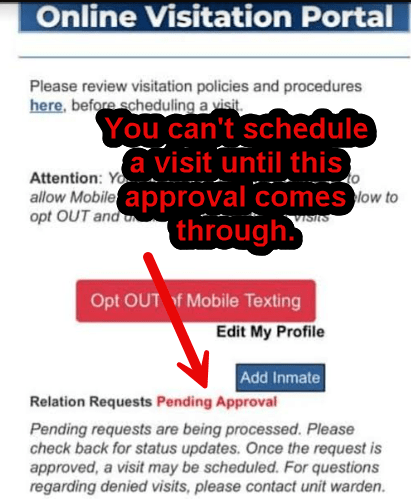 If you haven’t received your link, you may need to call the unit. They are supposed to email and text them out 10-30 minutes early, but sometimes are late, or sometimes really early. The links are sent by the CO handling visitation so they can get busy and there can be glitches. Sometimes they start the visit 10+ minutes early so be ready, and have your ID ready.